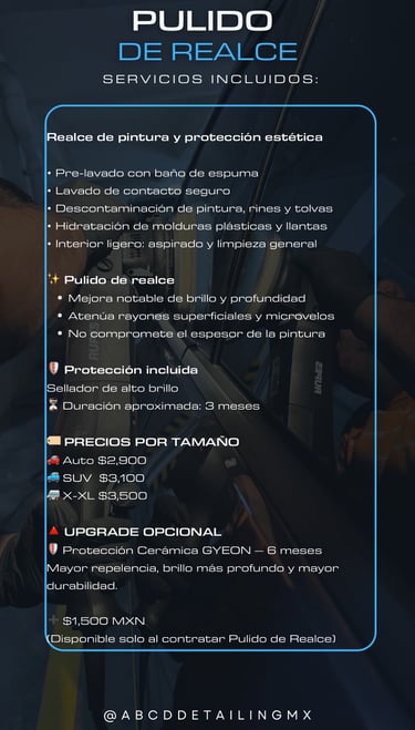 Es un proceso que elimina rayones, oxidación e imperfecciones de la capa superficial o "Clear" devolviendo brillo y uniformidad al vehículo, se puede hacer a 1, 2, o incluso 3 pasos teniendo en cuenta que a mayor numero de pasos mejor será el acabado. Sirve para restaurar la apariencia, aumentar el valor estético y regularmente va a acompañada de un tratamiento cerámico para proteger de futuros daños.